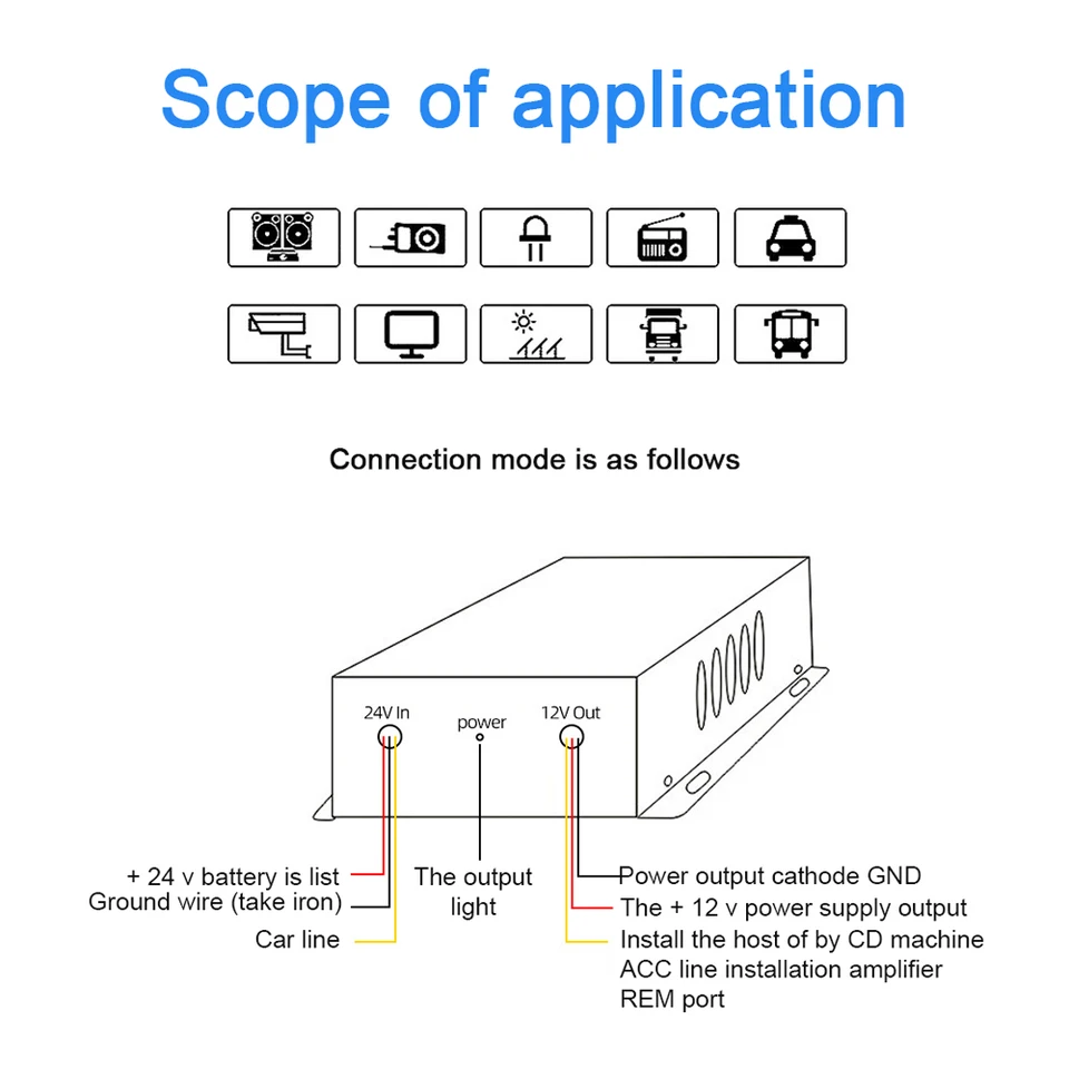 Cocok digunakan untuk kulkas mobil, pemutar DVD/VCD, subwoofer, walkie-talkie, kamera tampilan, dan berbagai perangkat lain yang memerlukan catu daya 12V stabil selama perjalanan.